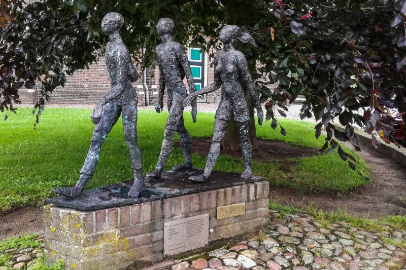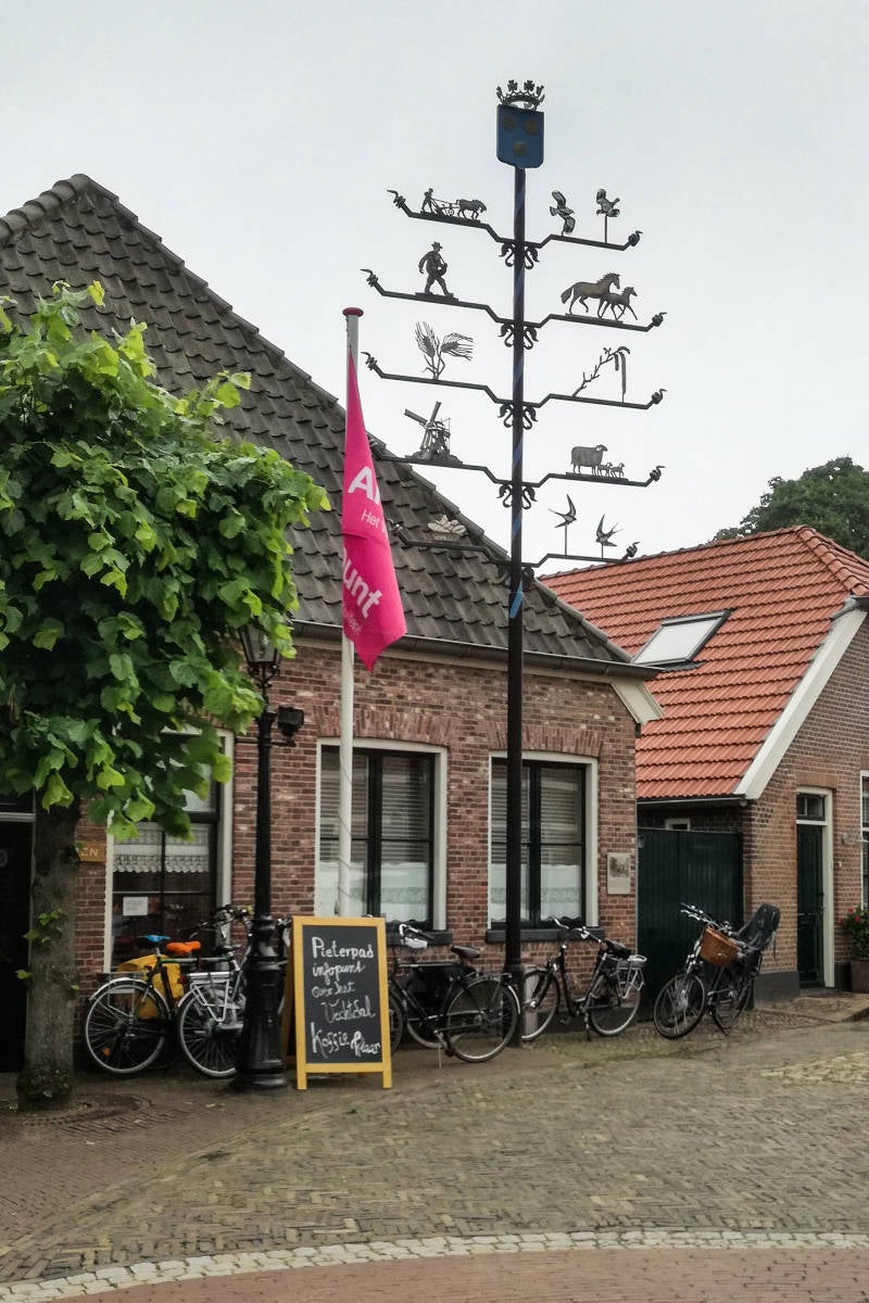 Naar Gramsbergen, mét stadsstatus! (ik vind het eerder een dorp, wel héél mooi!). Een kleine stadskern, Kruisstraat met "flinten", Meiboomplein (met meiboom) en een bronzen beeld van een groepje Pieterpadwandelaars.
