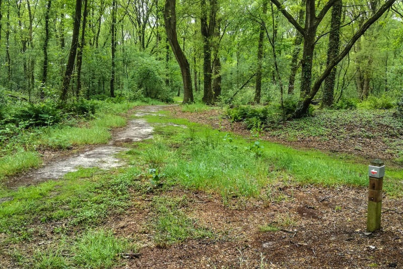 Verder; naar/door het dorpje Ane. Het monument van de slag om Ane heb ik gemist, de oude dorpsschool heb ik wel gezien. Meteen daarna het mooie Engelandsche Bos ingelopen, vernoemd naar het nabije buurtschap Engeland (= weideland!). Het is een gemengd bos, erg licht en gelegen op rivierduinen in een afgesneden meander van de Vecht. Het licht gekleurde zand is op de paden duidelijk te zien.
