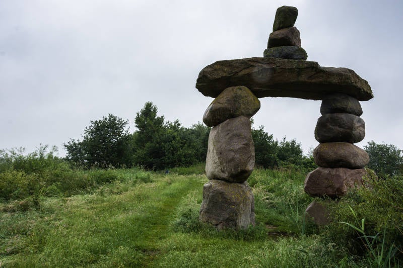 Het beeld "Drentse Poort" van beeldhouwer Rob Schreefel - 6,5 meter hoog - 33 ton aan stenen.