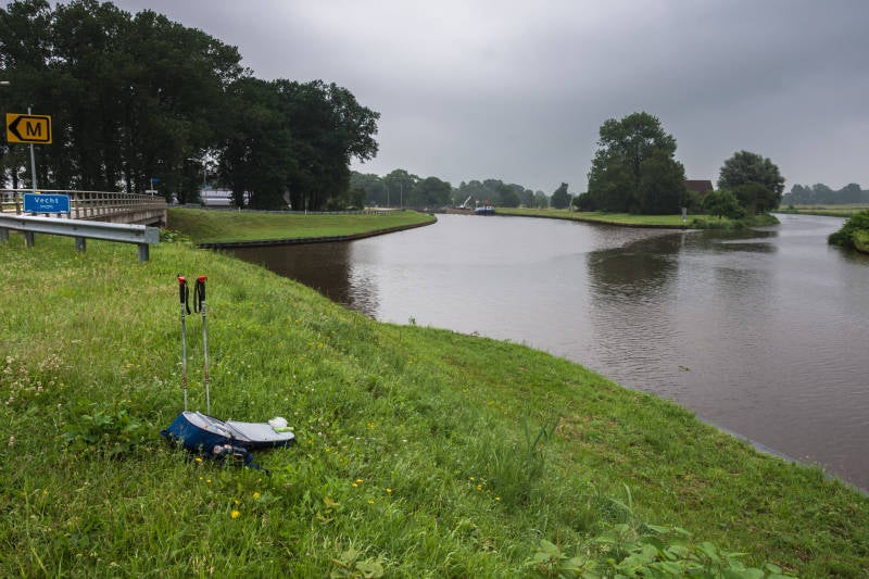 "Spaghetti-kruispunt" van de Vecht met 2 kanalen en een spoorlijn (en mijn prachtige wandel/skistokken van de Kringloop!)
